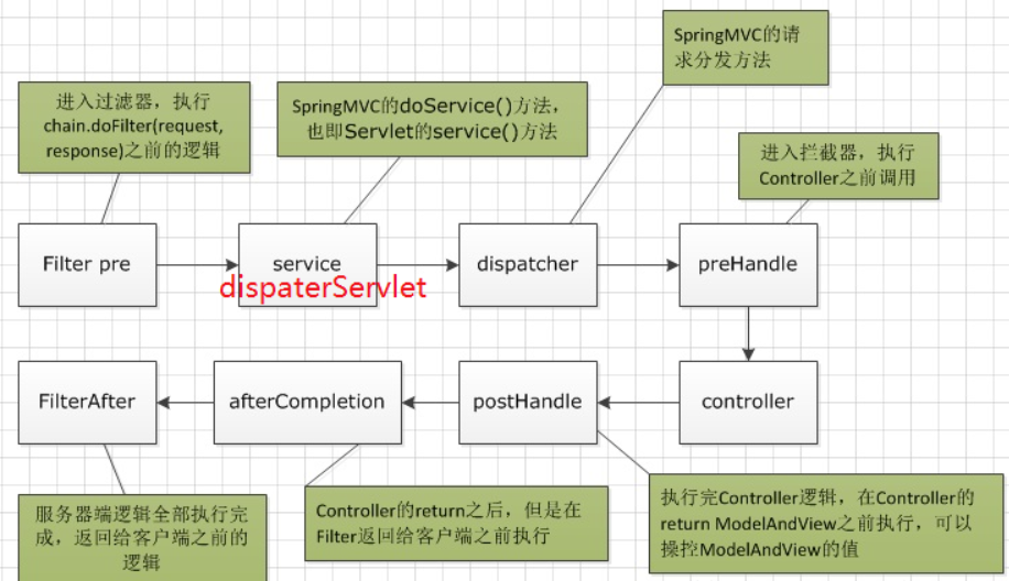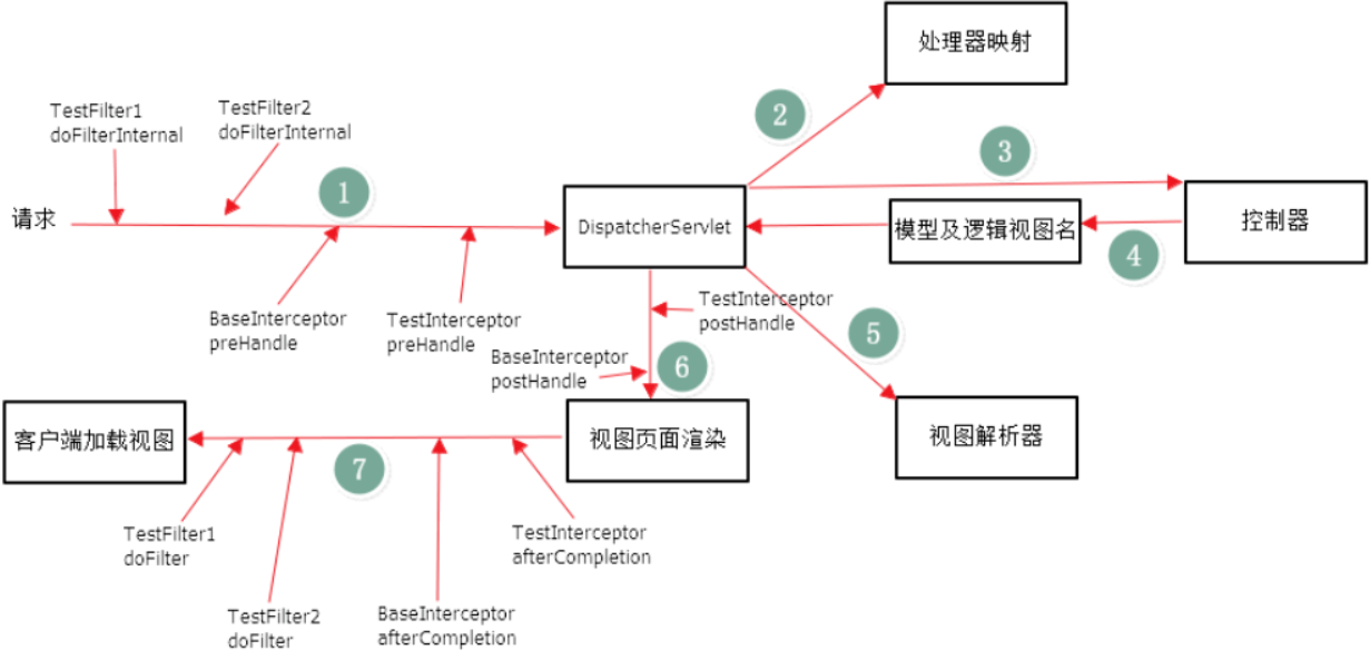 过滤前 => 拦截前 => AOP=> Controller=> AOP=> 拦截后 => 过滤后